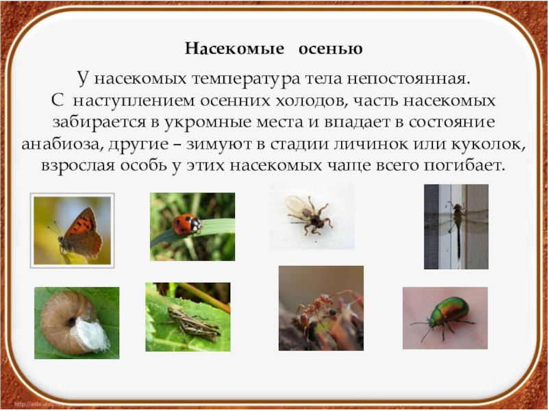 Насекомые  осенью У насекомых температура тела непостоянная. С наступлением осенних холодов, часть насекомых забирается в укромные