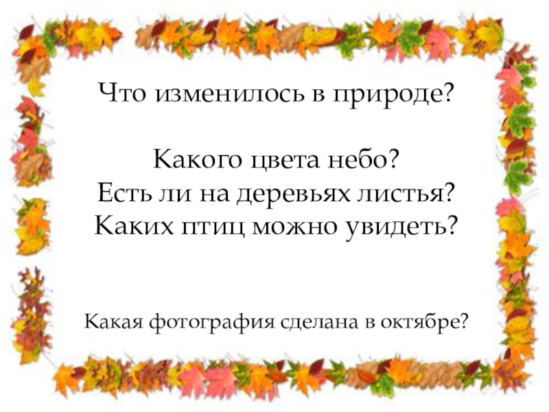Что изменилось в природе?Какого цвета небо?Есть ли на деревьях листья?Каких птиц можно увидеть?Какая фотография сделана в октябре?