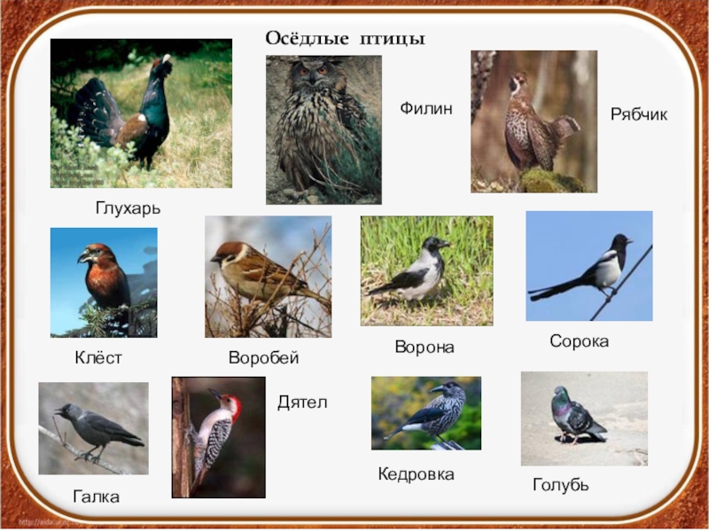 Осёдлые птицы     ГлухарьФилинРябчик   КлёстВоробейВоронаСорокаГалкаДятелКедровкаГолубь