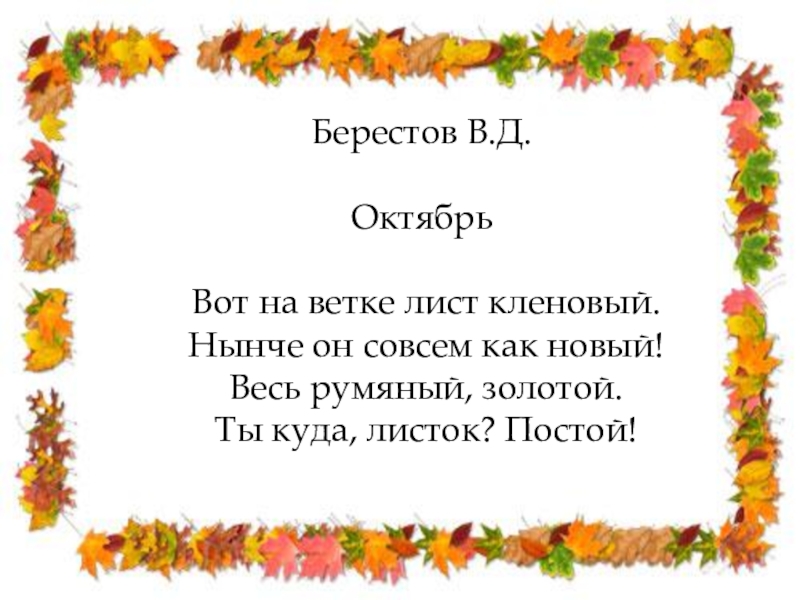 Берестов В.Д.Октябрь Вот на ветке лист кленовый. Нынче он совсем как новый! Весь румяный, золотой. Ты куда, листок? Постой!