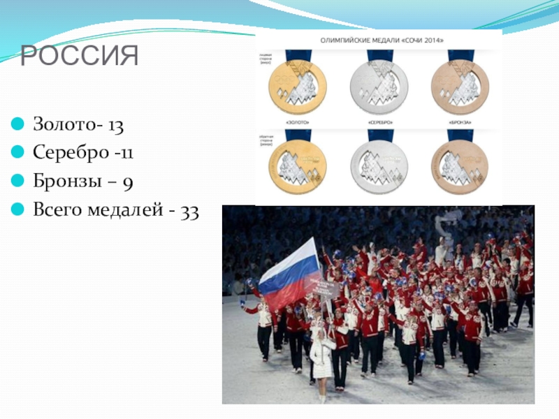 РоссияЗолото- 13Серебро -11Бронзы – 9Всего медалей - 33