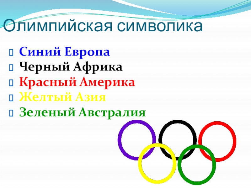 Олимпийская символикаСиний ЕвропаЧерный АфрикаКрасный АмерикаЖелтый Азия Зеленый Австралия
