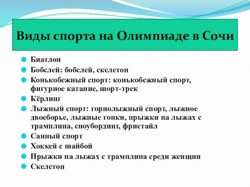 Виды спорта на Олимпиаде в СочиБиатлонБобслей: бобслей, скелетонКонькобежный спорт: конькобежный спорт, фигурное катание, шорт-трекКёрлингЛыжный спорт: горнолыжный спорт,