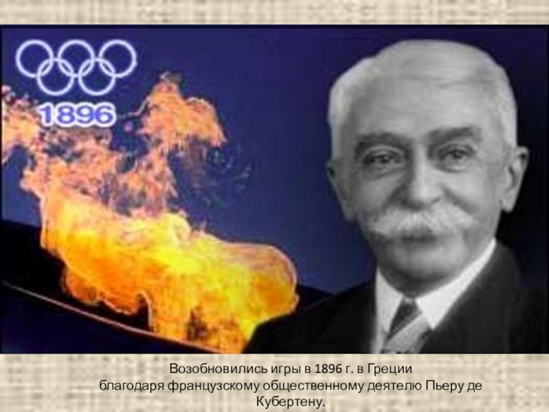 Возобновились игры в 1896 г. в Греции благодаря французскому общественному деятелю Пьеру де Кубертену.Олимпийские игры проводятся один