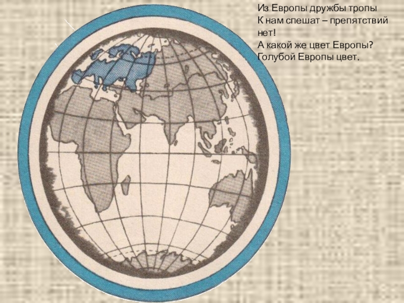 Из Европы дружбы тропыК нам спешат – препятствий нет!А какой же цвет Европы?Голубой Европы цвет.