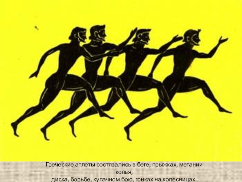 Греческие атлеты состязались в беге, прыжках, метании копья, диска, борьбе, кулачном бою, гонках на колесницах.