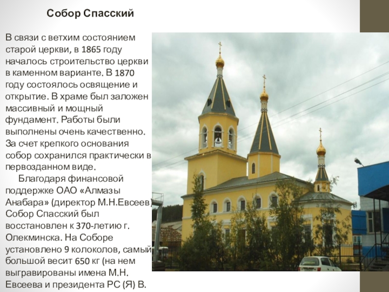 Благодаря финансовой поддержке ОАО «Алмазы Анабара» (директор М.Н.Евсеев) Собор Спасский был восстановлен к 370-летию г.Олекминска. На Соборе установлено 9 колоколов, самый большой весит 650 кг (на нем выгравированы имена М.Н.Евсеева и президента РС (Я) В.А.Штырова), а самый маленький – 7 кг.