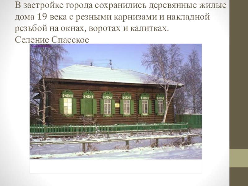 Слайд 6В застройке города сохранились деревянные жилые дома 19 века с резными