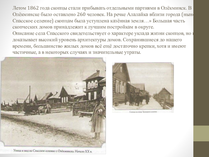 Олёкминске было оставлено 260 человек. На речке Алалайка вблизи города (ныне Спасское селение) скопцам была уступлена казённая земля…» Большая часть скопческих домов принадлежит к лучшим постройкам в округе.