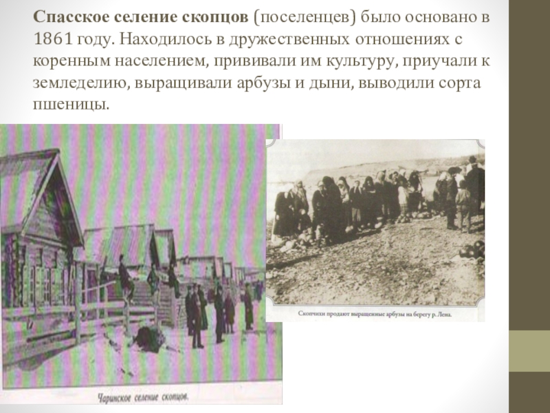 Слайд 8Спасское селение скопцов (поселенцев) было основано в 1861 году. Находилось в