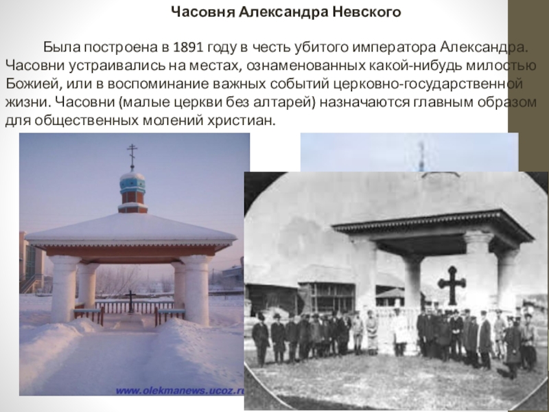 Была построена в 1891 году в честь убитого императора Александра. Часовни устраивались на местах, ознаменованных какой-нибудь милостью Божией, или в воспоминание важных событий церковно-государственной жизни. Часовни (малые церкви без алтарей) назначаются главным образом для общественных молений христиан.