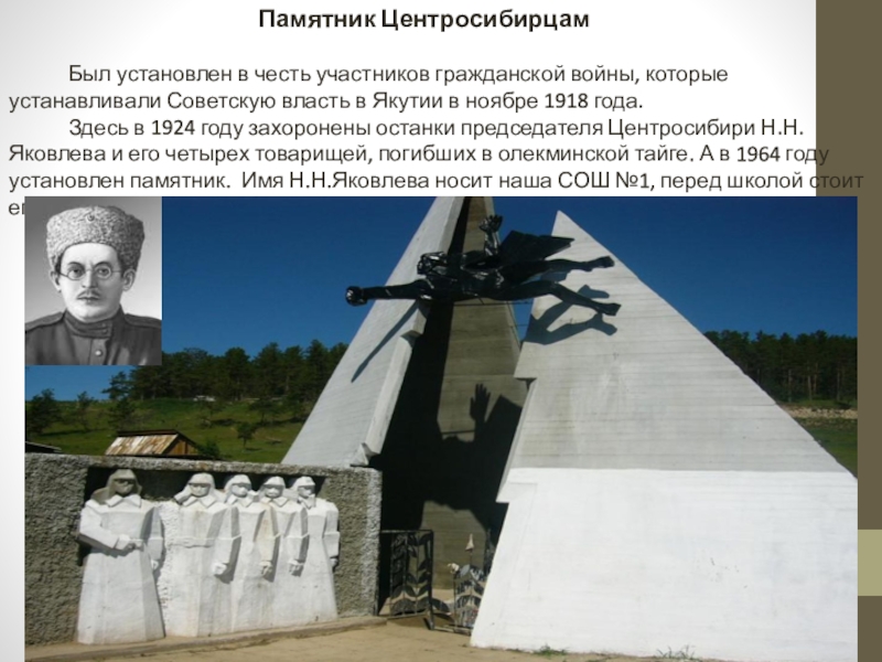 Здесь в 1924 году захоронены останки председателя Центросибири Н.Н.Яковлева и его четырех товарищей, погибших в олекминской тайге. А в 1964 году установлен памятник. Имя Н.Н.Яковлева носит наша СОШ №1, перед школой стоит его бюст.