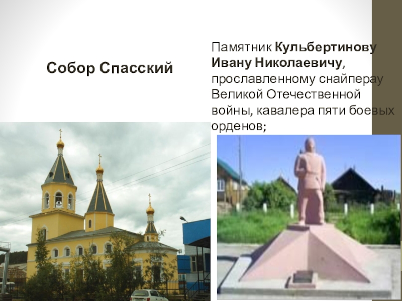 Слайд 13Памятник Кульбертинову Ивану Николаевичу, прославленному снайперау Великой Отечественной войны, кавалера пяти