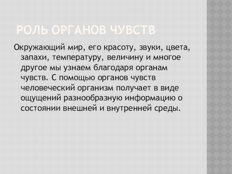 Роль органов чувствОкружающий мир, его красоту, звуки, цвета, запахи, температуру, величину и многое другое мы узнаем благодаря органам чувств. С помощью органов чувств человеческий организм получает в виде ощущений разнообразную информацию о состоянии внешней и