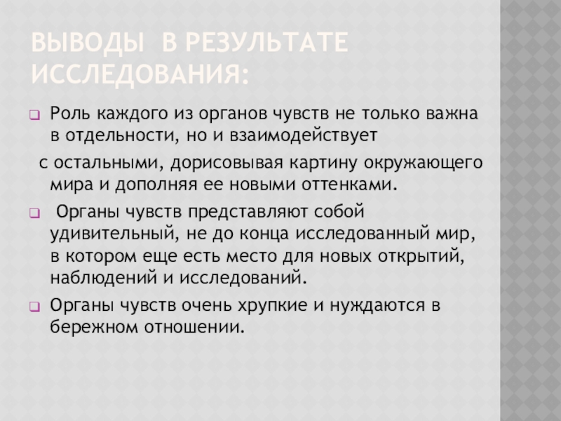 Выводы в результате исследования:Роль каждого из органов чувств не только важна в отдельности, но и взаимодействует с