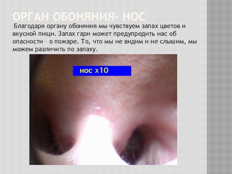 Орган обоняния- нос Благодаря органу обоняния мы чувствуем запах цветов и вкусной пищи. Запах гари может предупредить нас