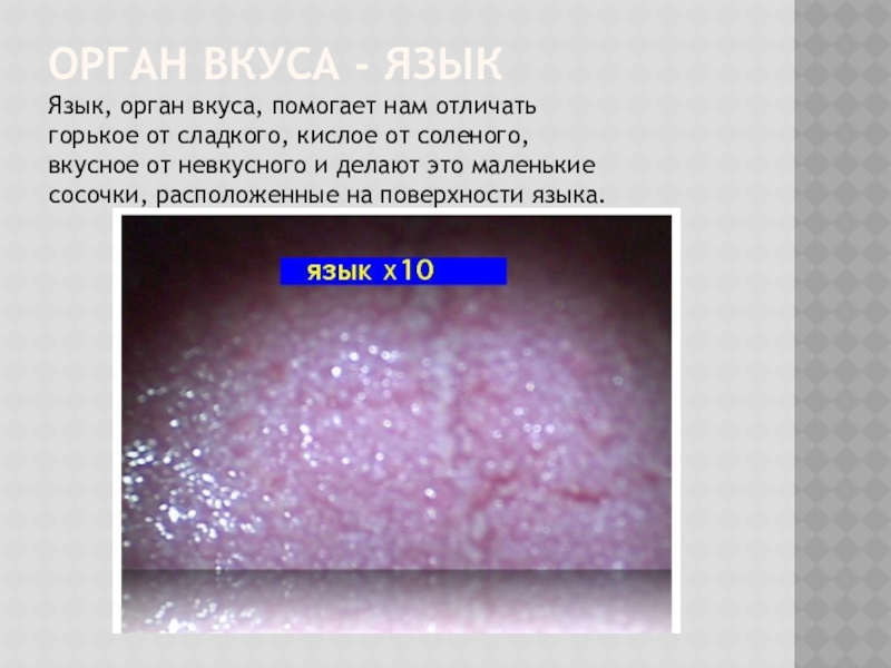 Орган вкуса - языкЯзык, орган вкуса, помогает нам отличать горькое от сладкого, кислое от соленого, вкусное от