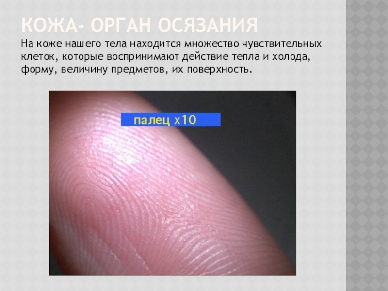 Кожа- орган осязанияНа коже нашего тела находится множество чувствительных клеток, которые воспринимают действие тепла и холода, форму,