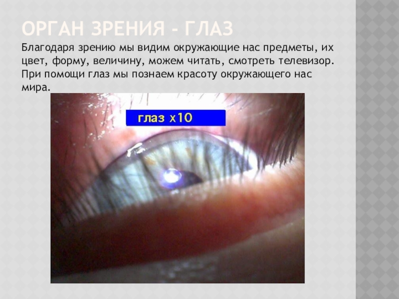 Орган зрения - глазБлагодаря зрению мы видим окружающие нас предметы, их цвет, форму, величину, можем читать, смотреть