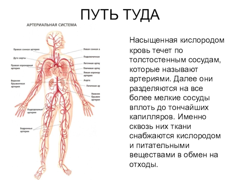 ПУТЬ ТУДА  Насыщенная кислородом кровь течет по толстостенным сосудам, которые называют артериями. Далее они разделяются на