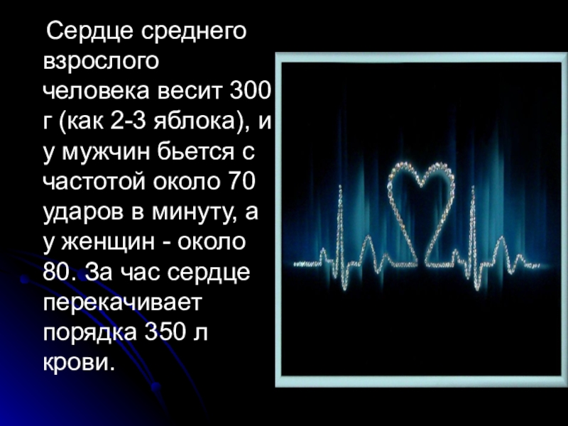 Сердце среднего взрослого человека весит 300 г (как 2-3 яблока), и у мужчин бьется с
