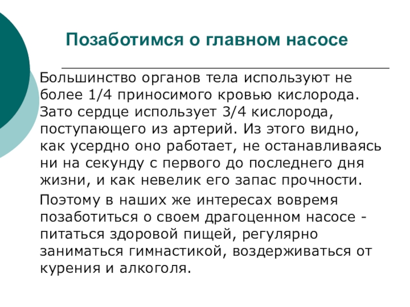 Позаботимся о главном насосе  Большинство органов тела используют не более 1/4 приносимого кровью кислорода. Зато сердце