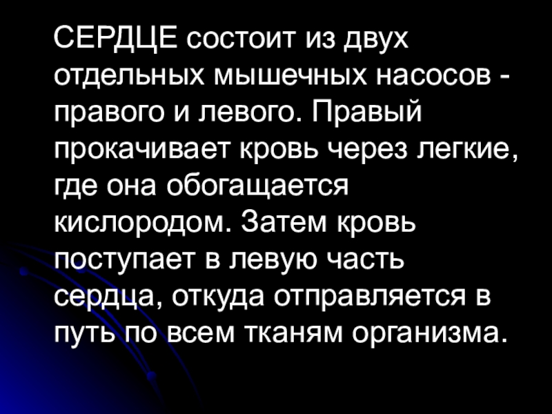 СЕРДЦЕ состоит из двух отдельных мышечных насосов - правого и левого. Правый прокачивает кровь через