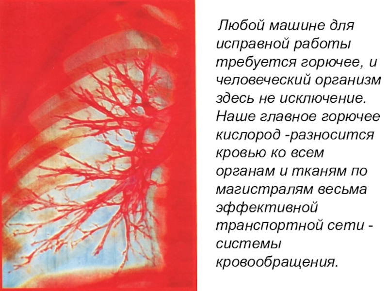 Любой машине для исправной работы требуется горючее, и человеческий организм здесь не исключение. Наше главное горючее кислород -разносится кровью ко всем органам и тканям по магистралям весьма эффективной транспортной сети - системы кровообращения.