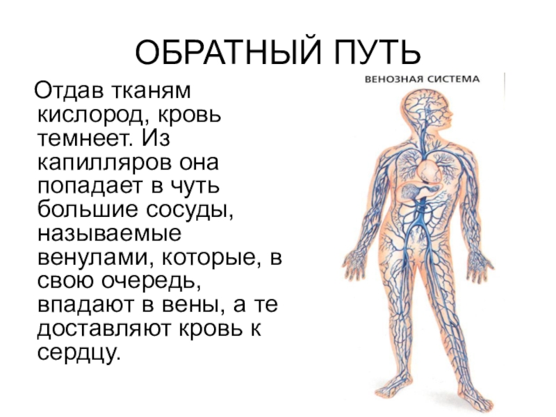 ОБРАТНЫЙ ПУТЬ  Отдав тканям кислород, кровь темнеет. Из капилляров она попадает в чуть большие сосуды, называемые