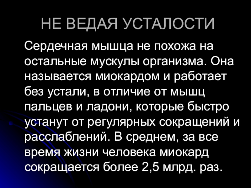 НЕ ВЕДАЯ УСТАЛОСТИ  Сердечная мышца не похожа на остальные мускулы организма. Она называется миокардом и работает