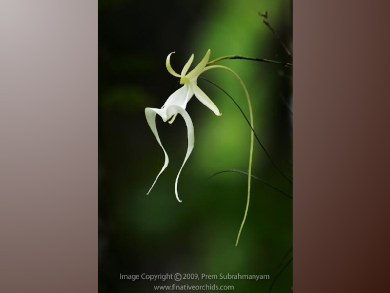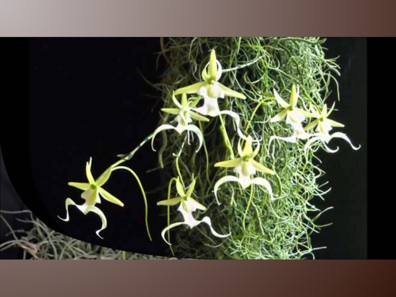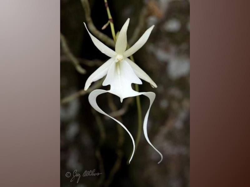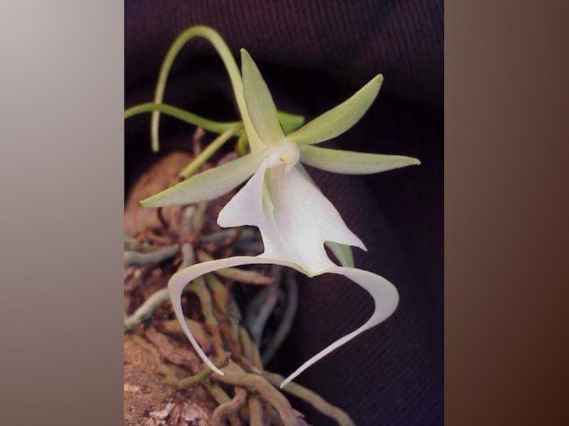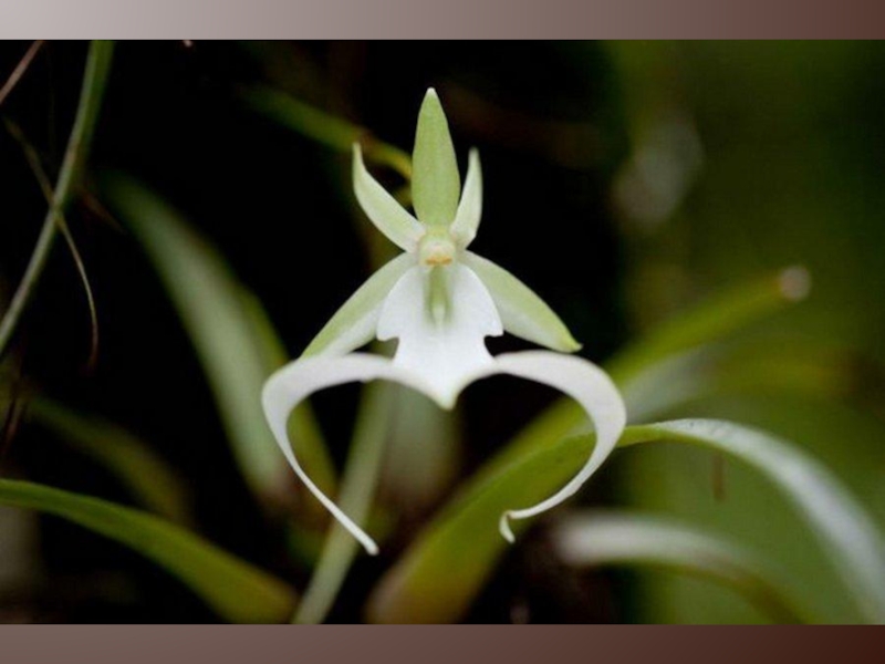 В отличие от других растений, это не имеет листьев. Сам цветок призрачно белый, и, кажется, будто он висит в воздухе ничем не поддерживаемый. Отсюда и название. На самом деле никто в воздухе не висит – просто стебель похож на «зеленый шнурок», плавно переходящий в корень. Распустившийся цветок орхидеи состоит из длинных лепестков-усиков, а нижние лепестки напоминают задние лапки прыгающей лягушки.