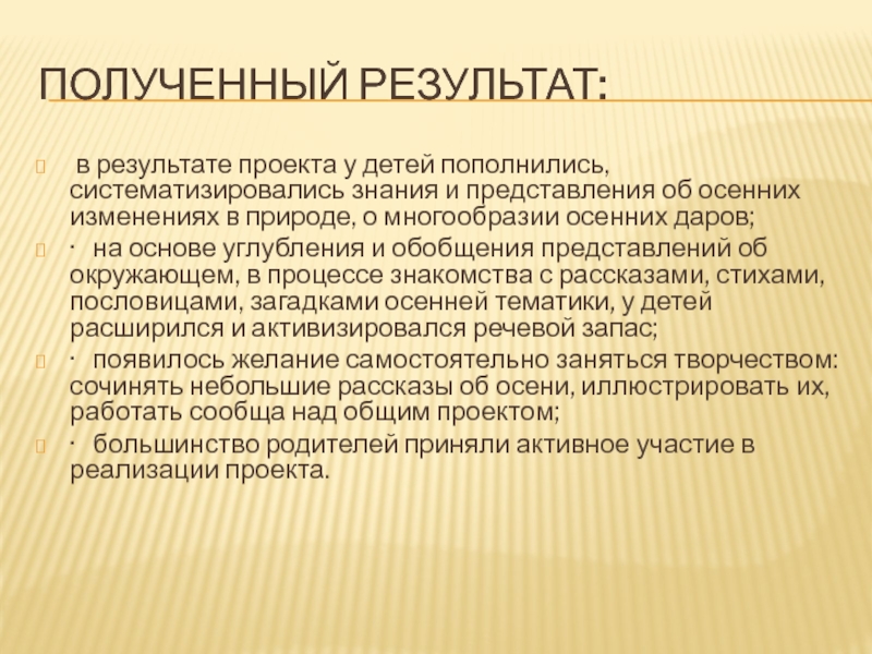 Полученный результат: в результате проекта у детей пополнились, систематизировались знания и представления об осенних изменениях в природе, о