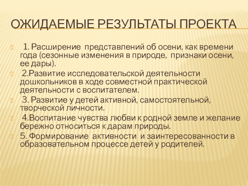 Ожидаемые Результаты проекта  1. Расширение представлений об осени, как времени года (сезонные изменения в природе, признаки осени, ее