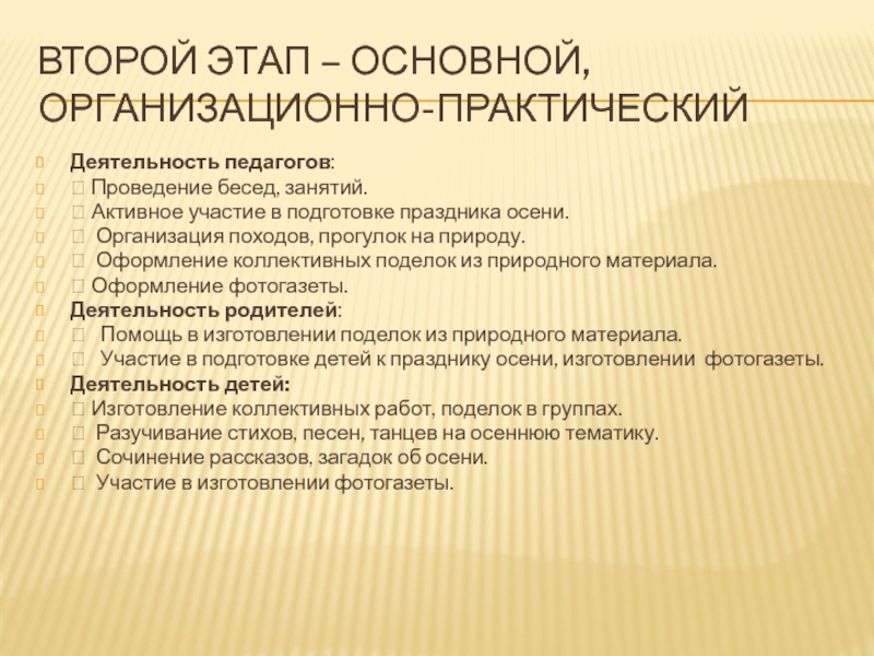 Второй этап – основной, организационно-практическийДеятельность педагогов:  Проведение бесед, занятий. Активное участие в подготовке праздника осени. Организация