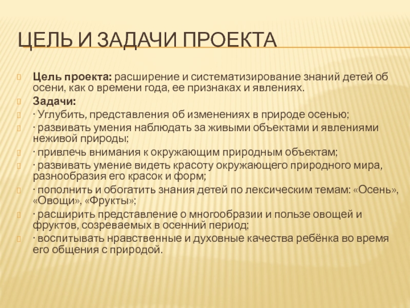 Цель и задачи проектаЦель проекта: расширение и систематизирование знаний детей об осени, как о времени года, ее признаках