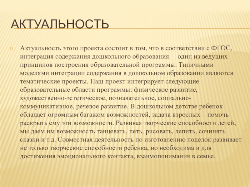 интеграция содержания дошкольного образования – один из ведущих принципов построения образовательной программы. Типичными моделями интеграции содержания в дошкольном образовании являются тематические проекты. Наш проект интегрирует следующие образовательные области программы: физическое развитие, художественно-эстетическое, познавательное, социально-коммуникативное, речевое развитие. В дошкольном детстве ребенок обладает огромным багажом возможностей, задача взрослых – помочь раскрыть ему эти возможности. Развивая творческие способности детей, мы даем им возможность танцевать, петь, рисовать, лепить, сочинять сказки и т.д. Совместная деятельность по изготовлению поделок развивает не только творческие способности ребенка, но необходима и для достижения эмоционального контакта, взаимопонимания в семье.