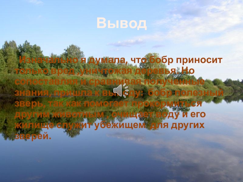 Но сопоставляя и сравнивая полученные знания, пришла к выводу: бобр полезный зверь, так как помогает прокормиться другим животным , очищает воду и его жилище служит убежищем для других зверей.