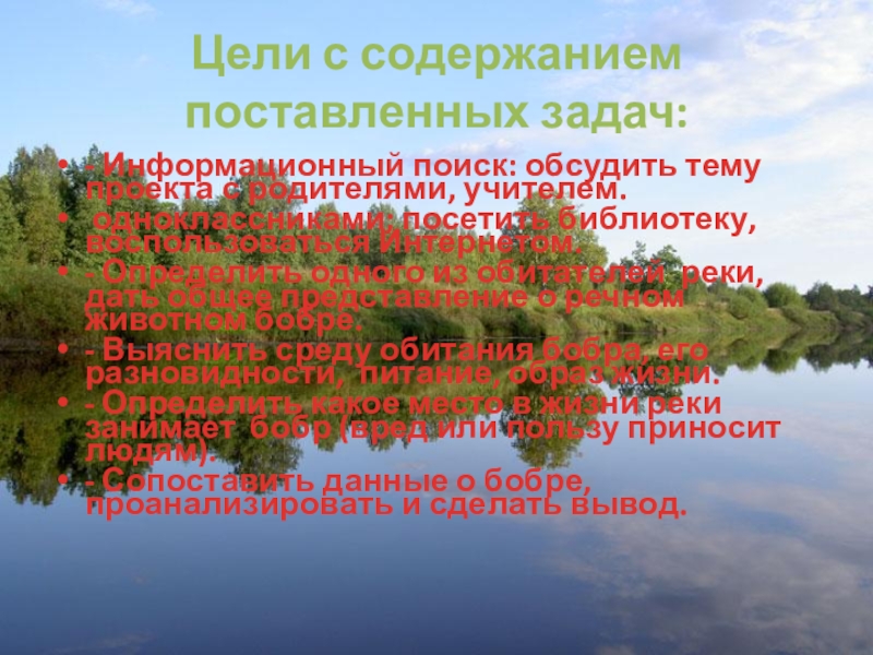 - Определить одного из обитателей реки, дать общее представление о речном животном бобре.