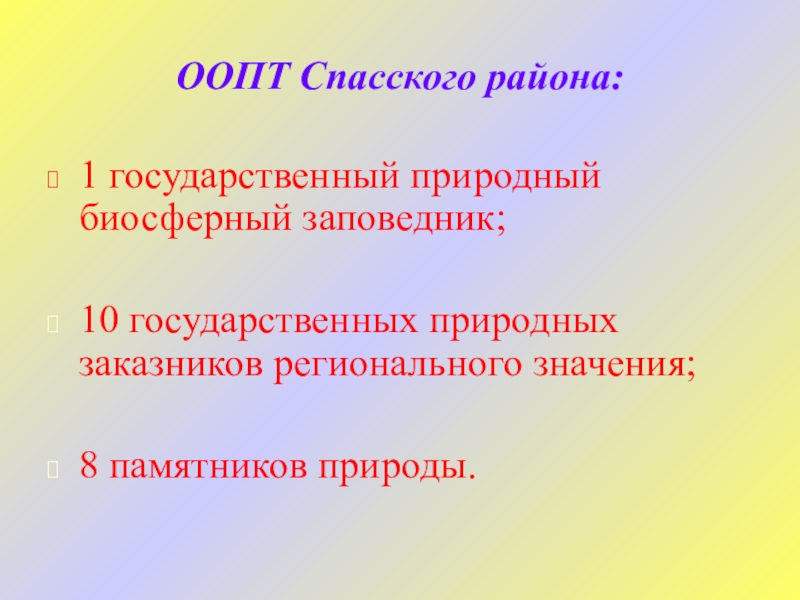 1 государственный природный биосферный заповедник;10 государственных природных заказников регионального значения;8 памятников природы. ООПТ Спасского района: