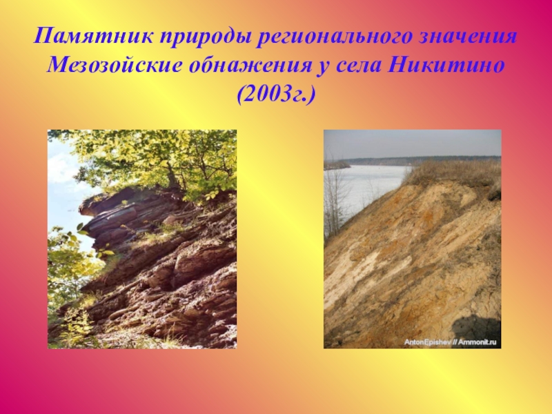 Слайд 12Памятник природы регионального значения Мезозойские обнажения у села Никитино (2003г.)