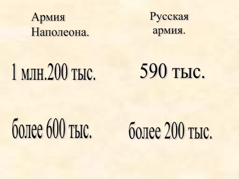 Армия  Наполеона.Русская   армия.1 млн.200 тыс.590 тыс.более 600 тыс.более 200 тыс.