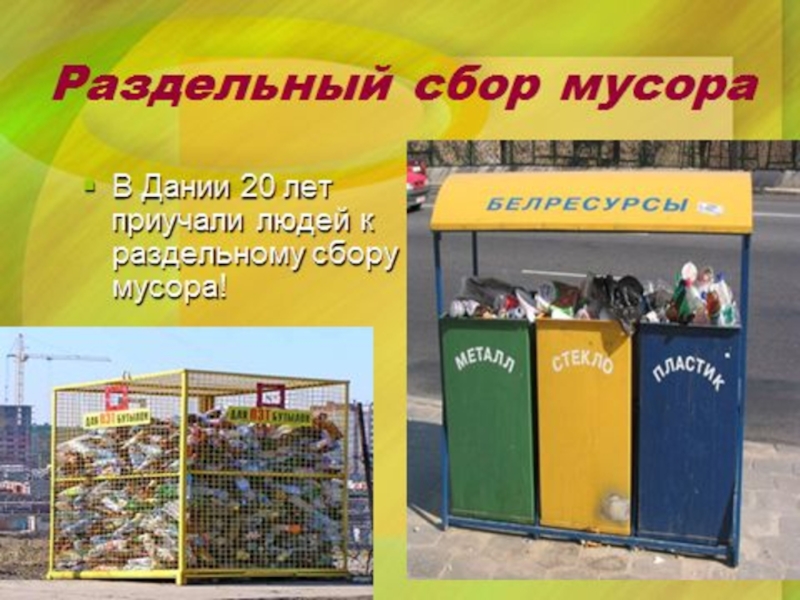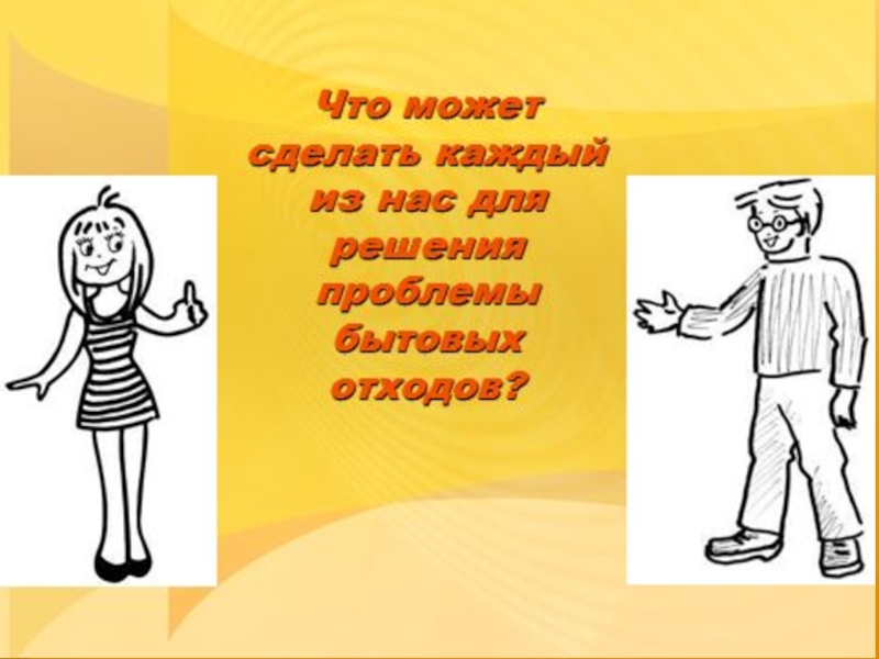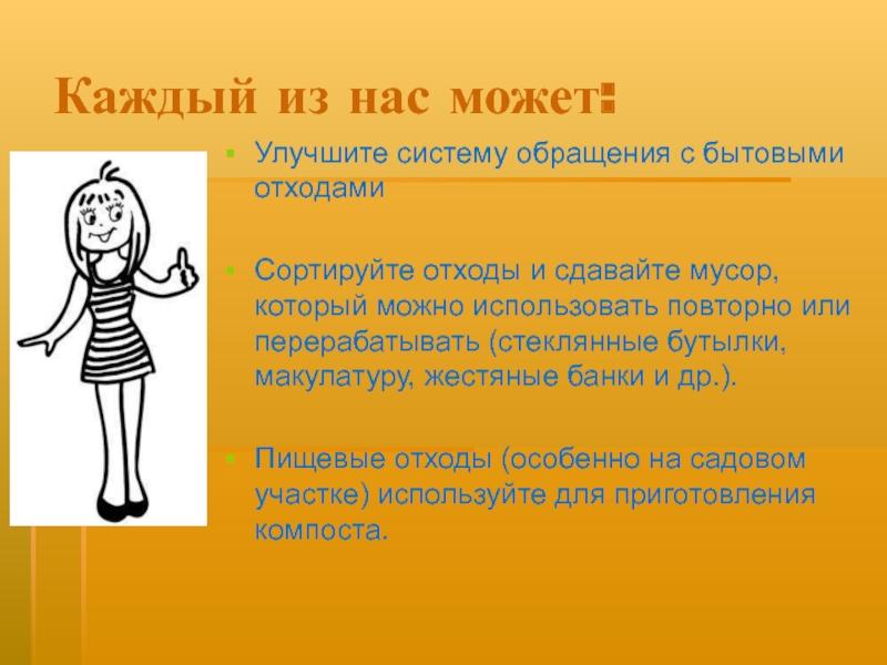 Каждый из нас может:Улучшите систему обращения с бытовыми отходамиСортируйте отходы и сдавайте мусор, который можно использовать повторно