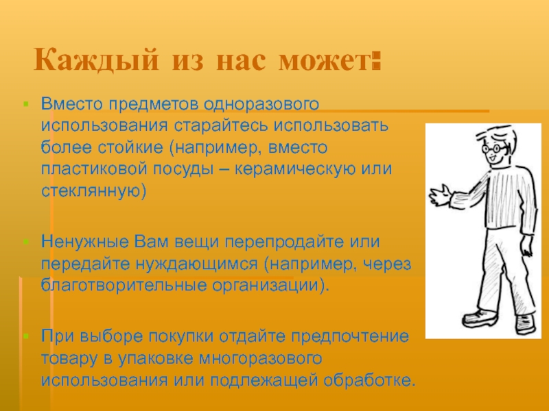 Каждый из нас может:Вместо предметов одноразового использования старайтесь использовать более стойкие (например, вместо пластиковой посуды – керамическую