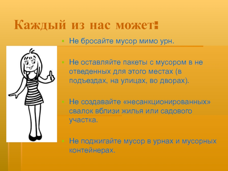 Каждый из нас может:Не бросайте мусор мимо урн.Не оставляйте пакеты с мусором в не отведенных для этого