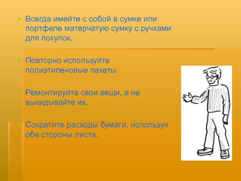 Слайд 44Всегда имейте с собой в сумке или портфеле матерчатую сумку с
