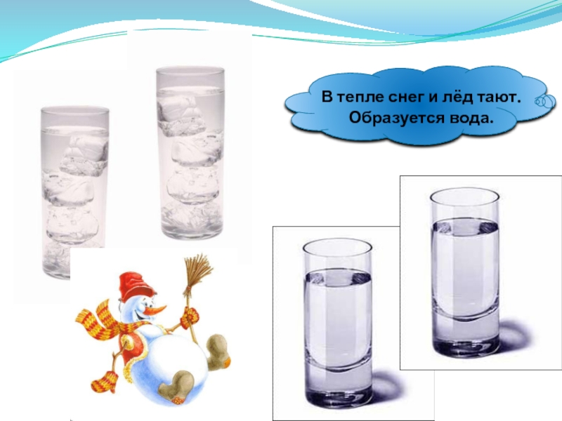 Слайд 4В тепле снег и лёд тают. Образуется вода.