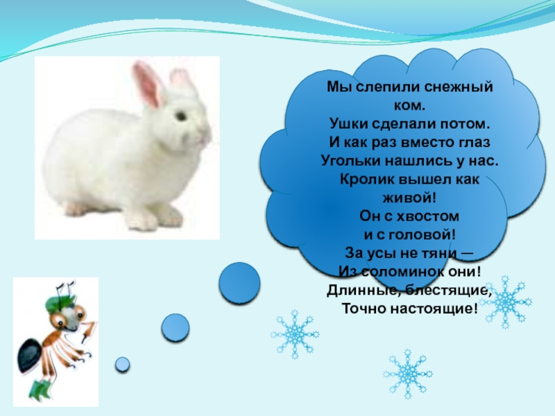 Слайд 19 Мы слепили снежный ком. Ушки сделали потом. И как раз вместо глаз Угольки нашлись у нас. Кролик