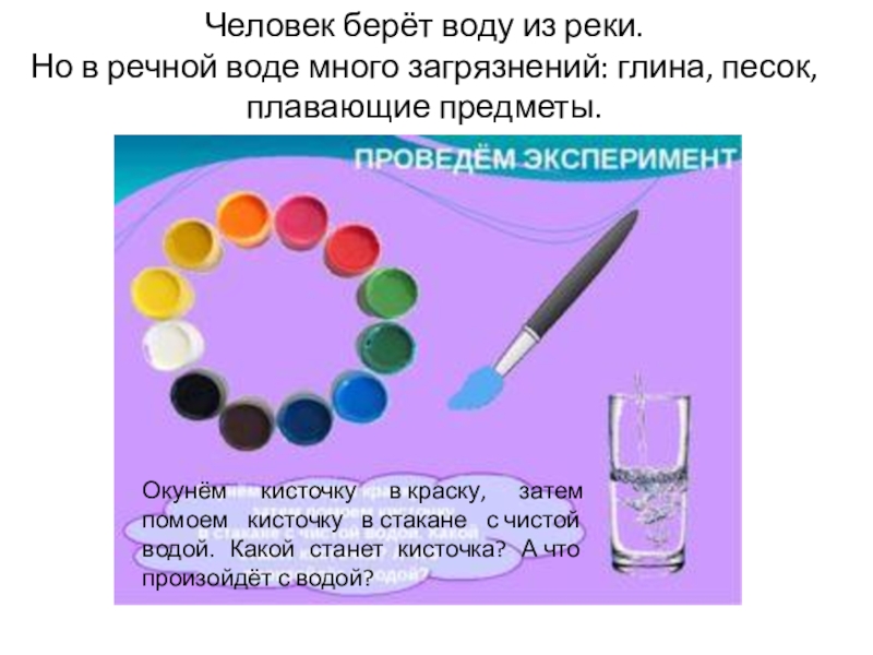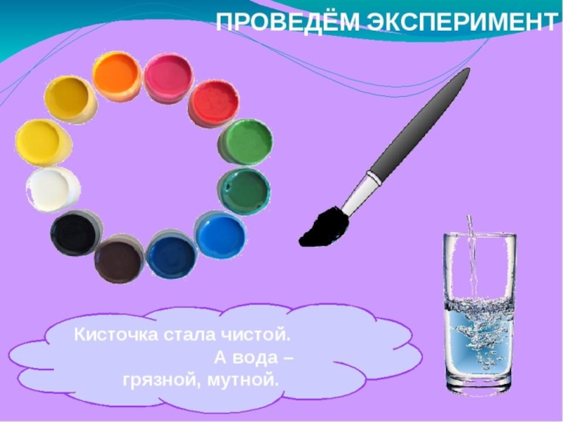 Окунём кисточку в краску, затем помоем кисточку в стакане с чистой водой. Какой станет кисточка? А что произойдёт с водой?