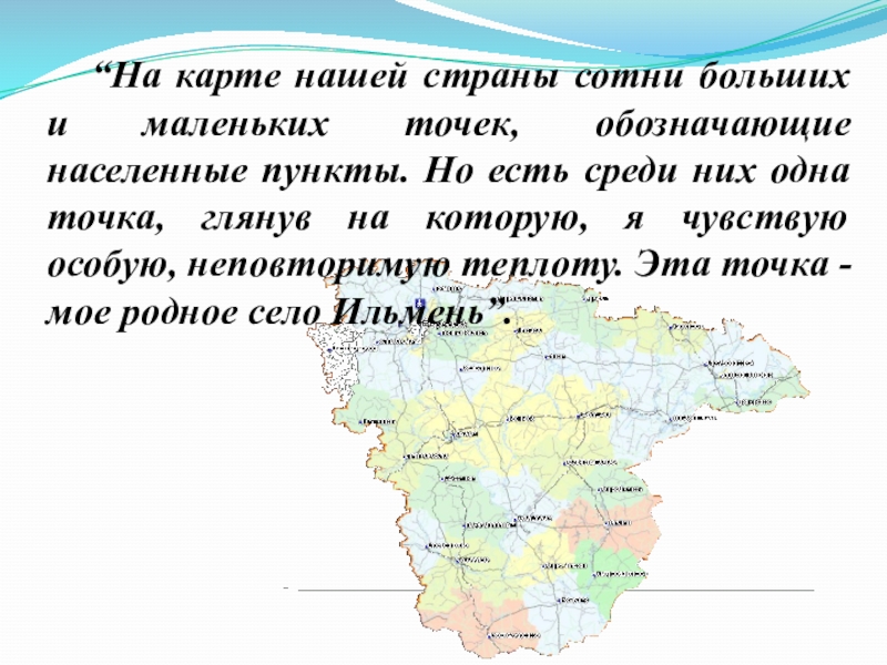 пункты. Но есть среди них одна точка, глянув на которую, я чувствую особую, неповторимую теплоту. Эта точка - мое родное село Ильмень”.