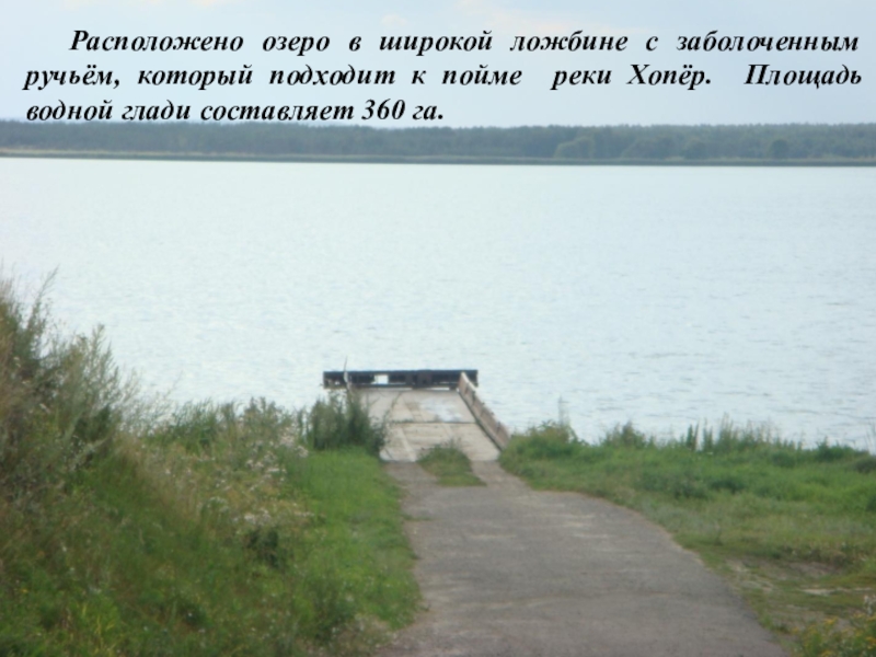 Слайд 7 Расположено озеро в широкой ложбине с заболоченным ручьём, который подходит к